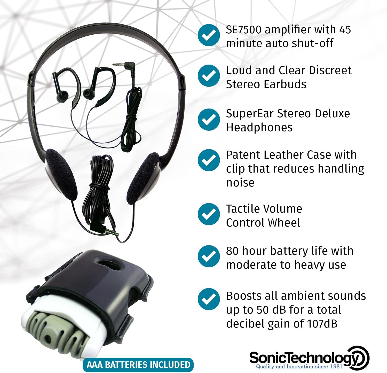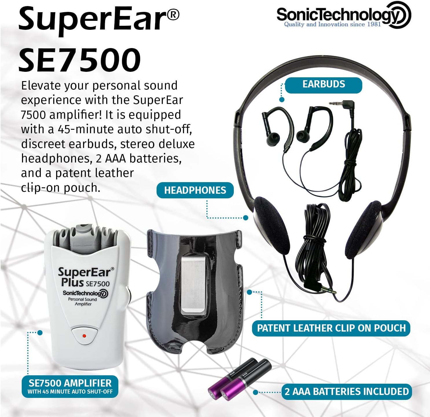 ABOUT US: Sonic Technology created the SuperEar Personal Sound Amplifier to provide economical and easy-to-use amplification with improvements such as the SuperEar Plus SE7500, the SuperEar SE5000, and the SuperEar Rechargeable SE9000HP. Since 1986, our personal headphone voice amplifier for elderly have helped amplify the world, and always come with a warranty for quality assurance. Give your ears a boost with our Personal Sound Amplifier!