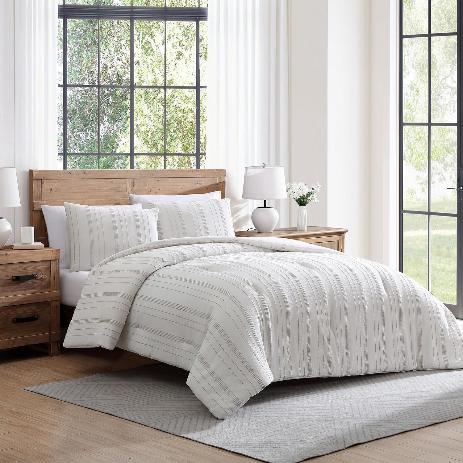Tahari Home – Comforter Set, Soft Lightweight Bedding with Matching Pillow Shams, Dorm Room Essentials, Distressed Stripe Home Decor (Mellie White/Grey, King)
