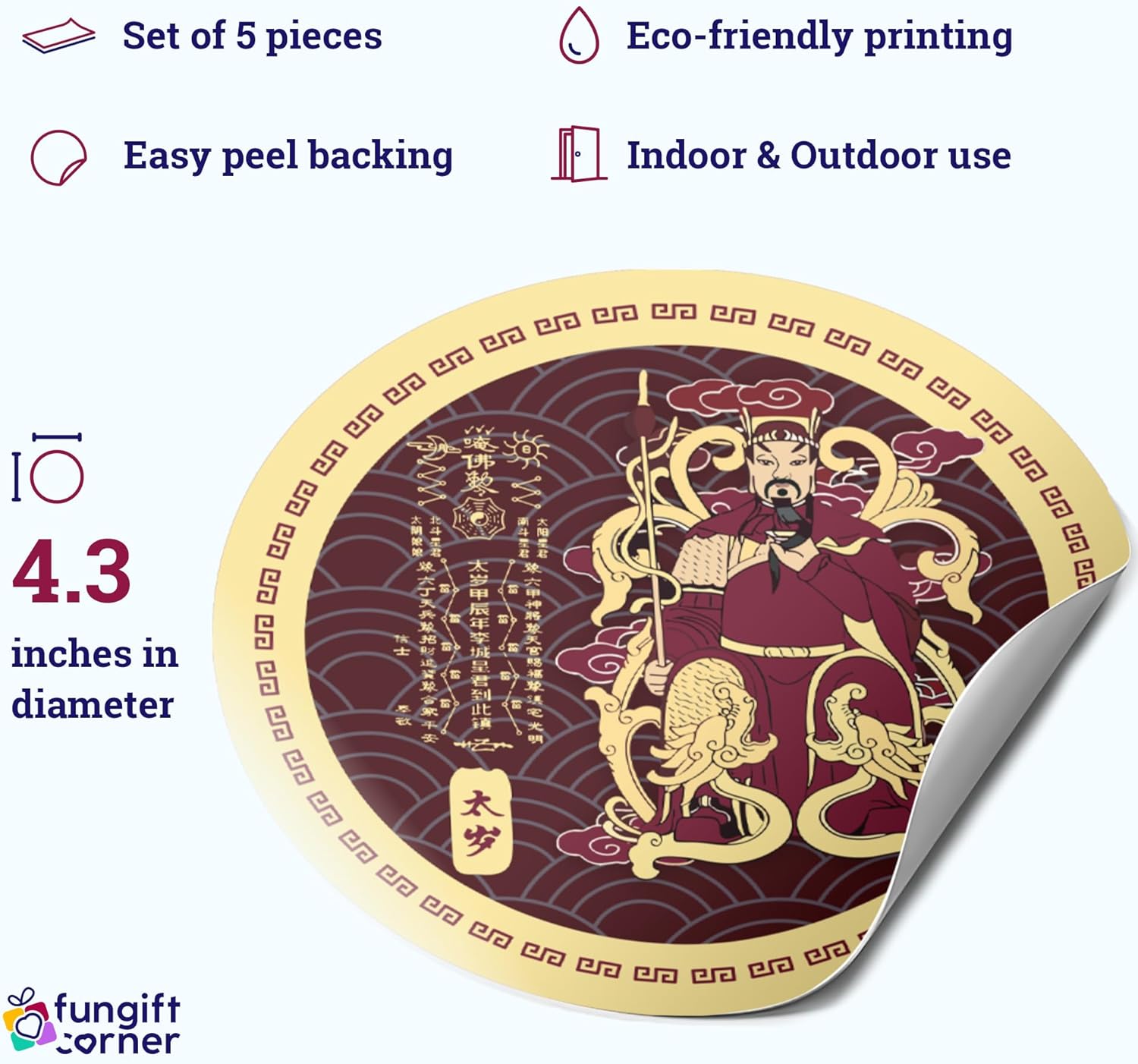TAI SUI 2025 AMULET: This set of 5 beautifully designed feng shui stickers features the image of Tai Sui General Wu Sui, the celestial ruler of 2025, offering powerful protection and support for the year of the Snake