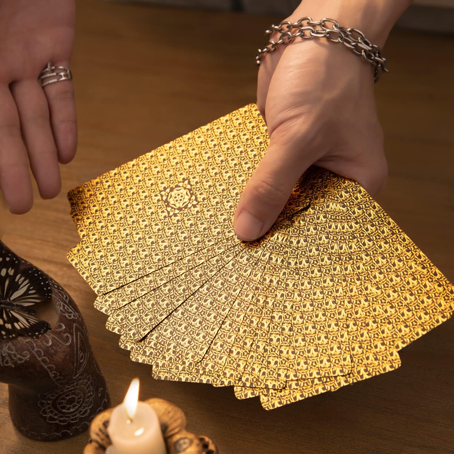 These card are super pretty. The set comes with 2 extra cards and a guide book. The material is strong and seems like it will withstand wear and tear when using. The gold is highly detailed and absolutely stunning. The guide book seems to be lacking in depth of instructions but goes through enough detail making it more of a second set not a beginners.