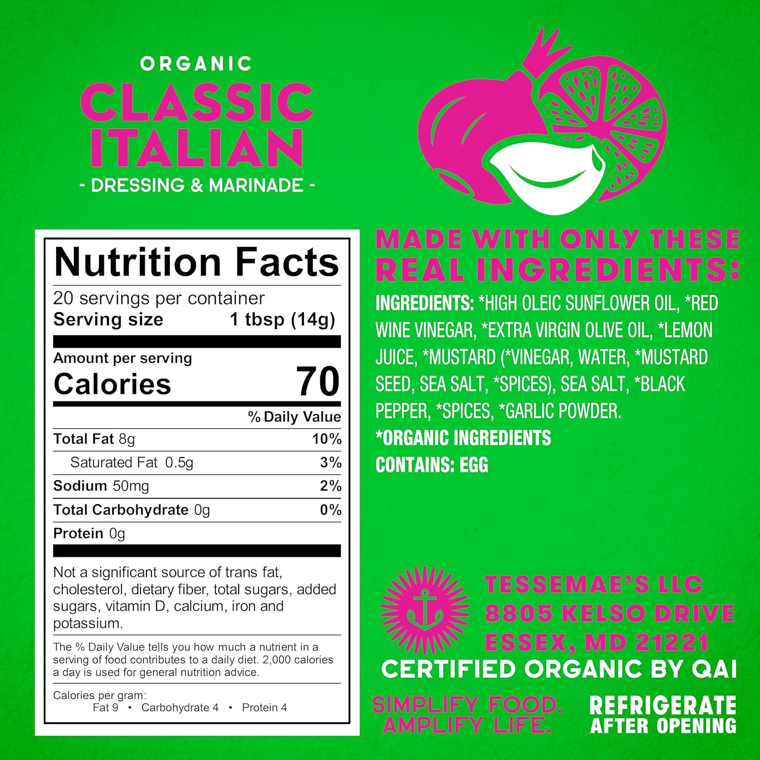 Organic Italian Dressing: Tessemae classic Italian dressing is made with organic ingredients like red wine vinegar and extra virgin olive oil for a deliciously authentic taste