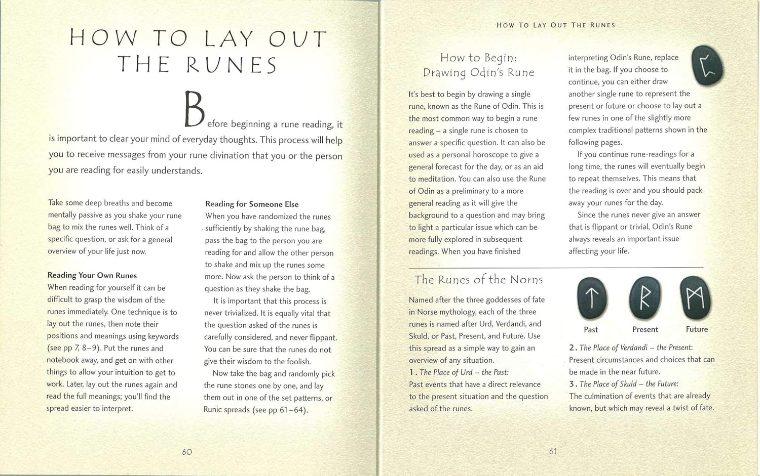 This is a helpful and easy to understand reference. It’s basic, but still gives a sufficient amount of information. It’s very colorful and ends with a tutorial on some different ways to do a rune reading and what the different spreads mean and when you’d want to use them.