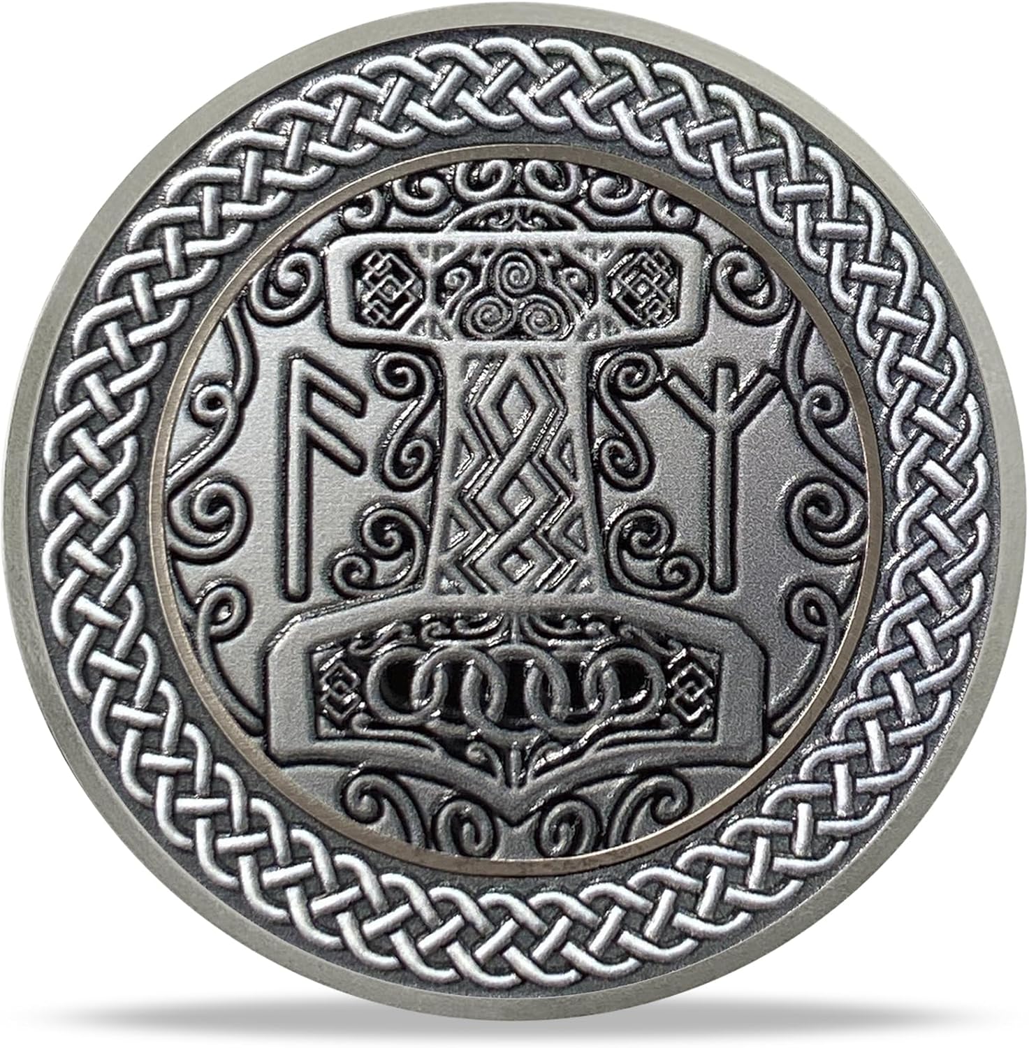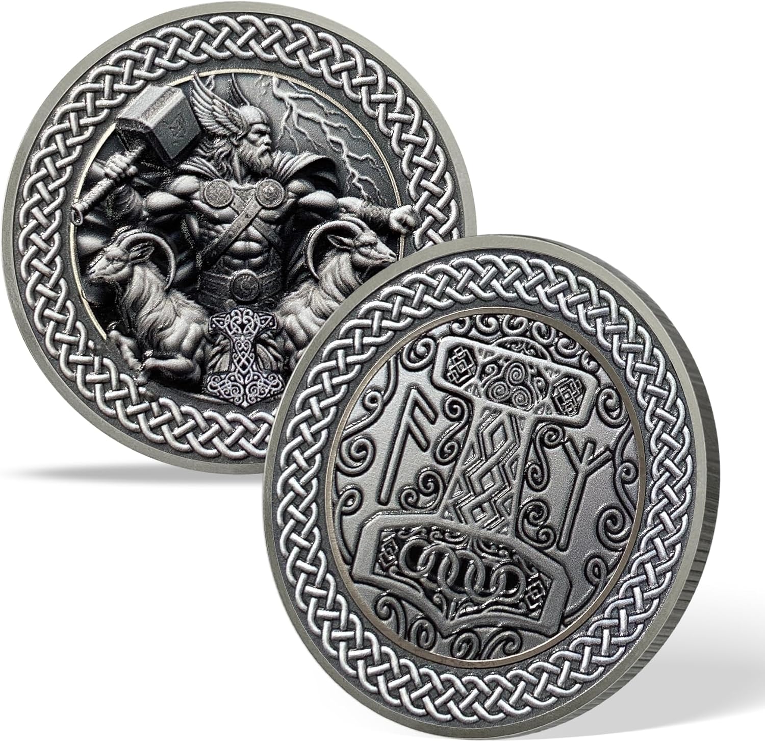 Elegant Design Front Design: The front side of the coin features a powerful image of Thor wielding his mighty hammer, Mjölnir, flanked by two rams, symbolizing strength, protection, and power in Norse mythology. The scene is surrounded by intricate knotwork, embodying the timeless spirit of Viking culture. Back Design: The reverse side displays Thor’s hammer encircled by ancient Norse runes, providing a connection to Viking traditions and offering a source of daily strength and inspiration.