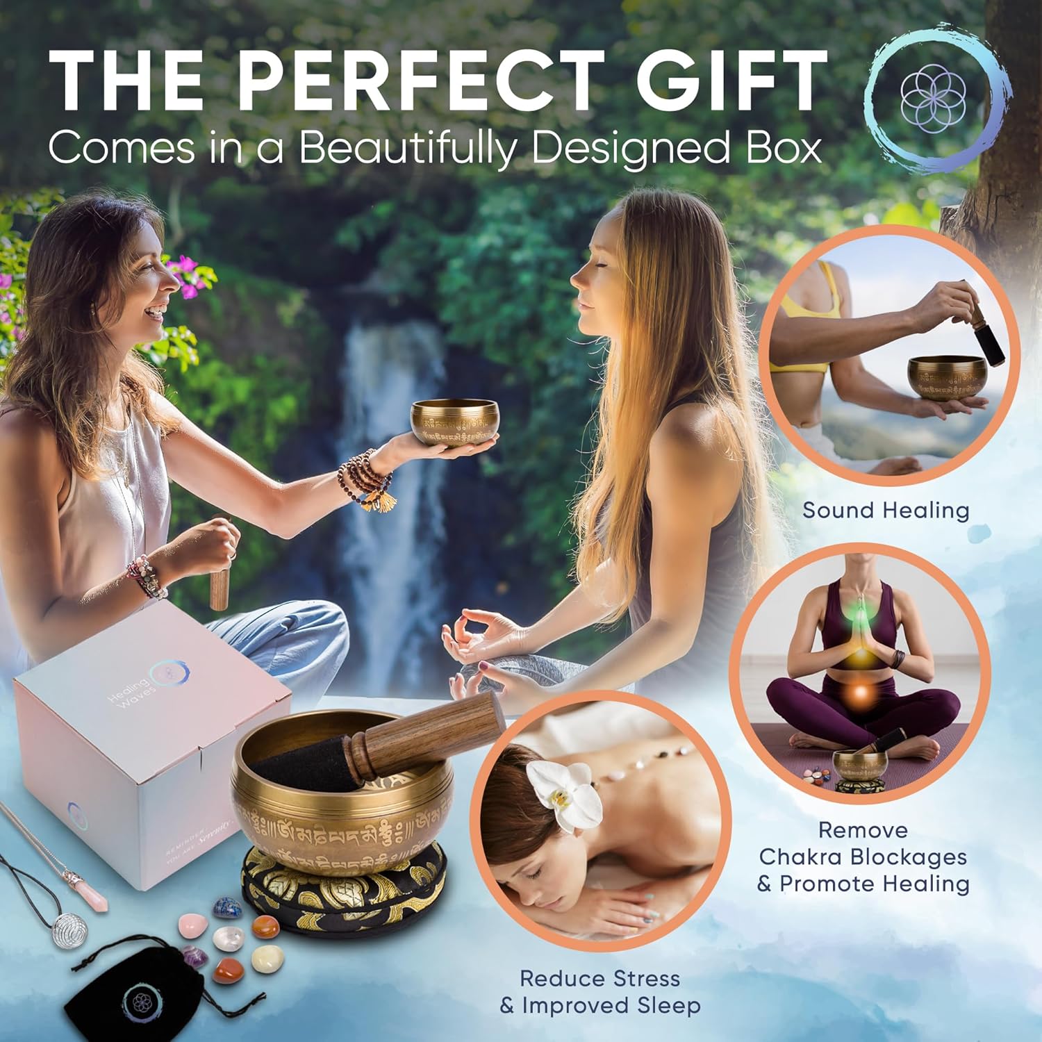 GIFT OF HARMONY – This set is the first to combine the power of singing bowls and Chakra stones. Each one includes authentic 4″ Tibetan singing bowls hand-crafted by skilled Artisans in Nepal , wooden mallet, hand-sewed cushion, and 7 chakra crystal tumble stones (Amethyst, clear quartz, lapis lazuli, rose quartz, red jasper, citrine, and carnelian) which you can wear with your free interchangeable bead cage Pendant and a Velvet pouch to protect it.