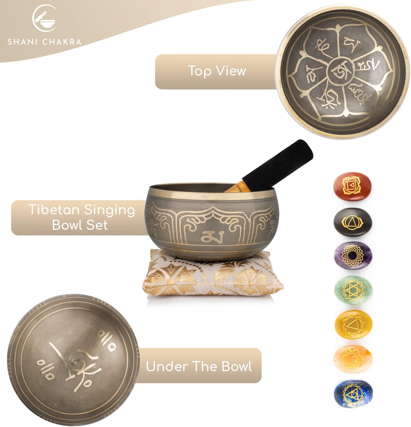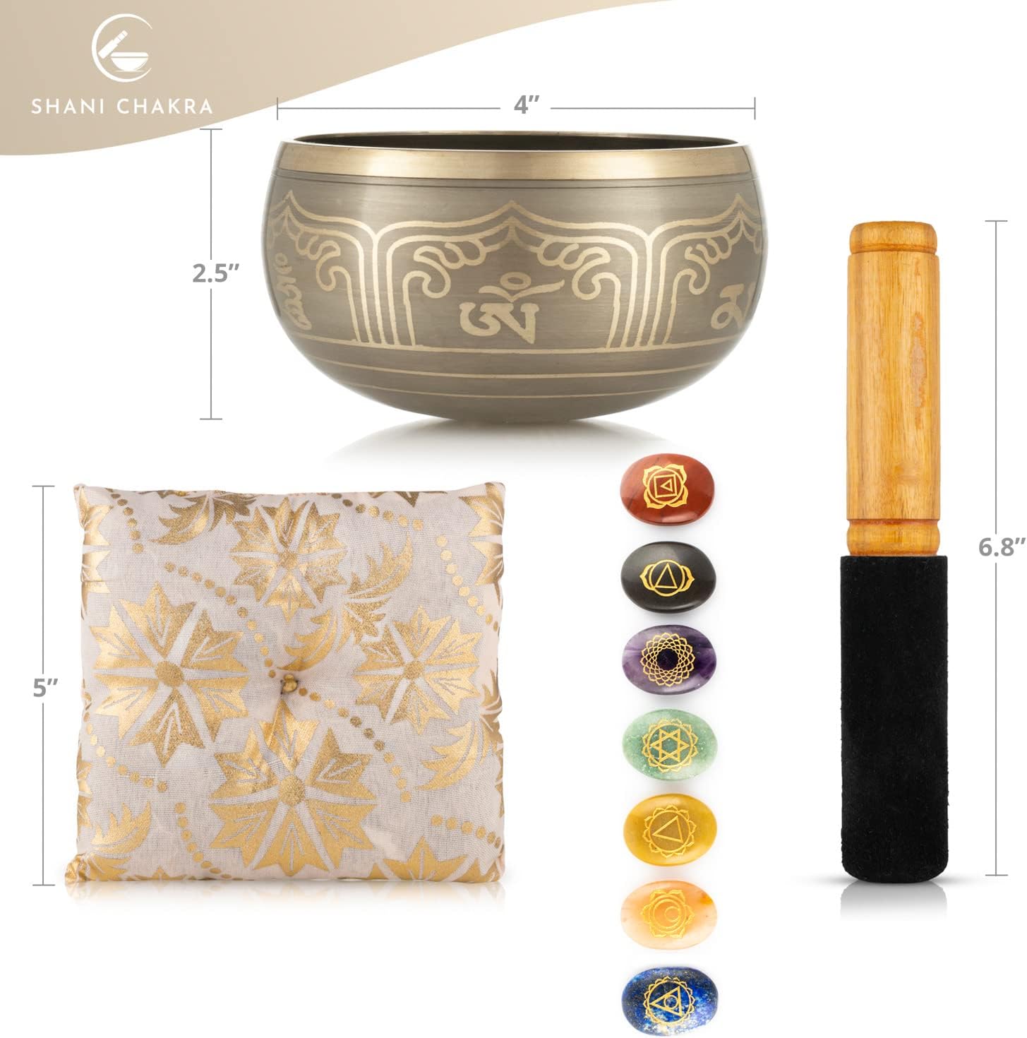 Tibetan Singing Bowl Set for Meditation – Metal Alloy Sound Bowl, Wooden Mallet, Cushion, and 7 Chakra Crystals to Calm, Relax, and Restore – Meditation Accessories and Decor by Shani Chakra