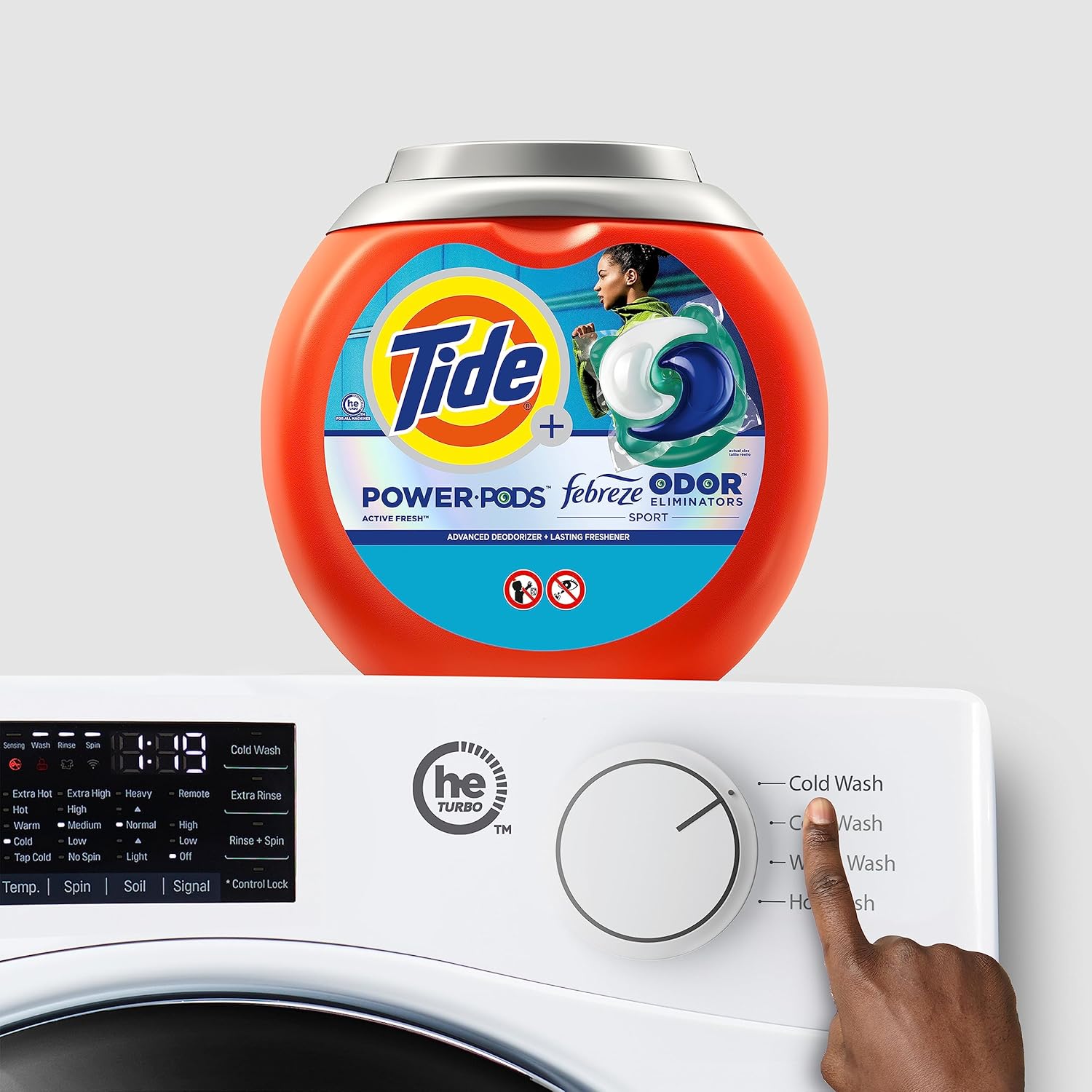Tide POWER PODS Febreze Odor Eliminators Plus Sport laundry detergent fights tough stains and set-in odors while providing freshness in laundry detergent pods. Tide POWER PODS have 50% more cleaning power than Tide liquid laundry detergent and are designed to fight stains and act as an odor eliminator in every type of load, leaving clothes smelling fresh with a single laundry pod. With 4-in-1 technology, these laundry pods deliver a combination of concentrated laundry detergent, Febreze odors eliminators, stains removers, and long-lasting freshness all-in-one solution—perfect for handling your stinky workout and athletic gear. Tide POWER PODS Plus Febreze laundry soap and odor eliminator help eliminate set-in stink at the source while leaving garments with a good-smelling Active Fresh scent. These laundry detergent pods work in all washing machines and water conditions—especially cold water. More than a regular laundry soap, Tide POWER PODS Plus Febreze Sport give you the clean you expect from America’s #1 most trusted laundry detergent brand*. *Voted most-trusted laundry brand by American shoppers based on the 2022 BrandSpark American trust survey.
