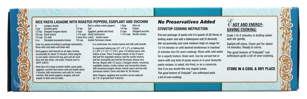 Tinkyada has devoted their efforts to debunking the myth that rice pasta is mushy or has a strange texture! These brown rice pasta lasagne are a wheat-free, gluten-free and cholesterol-free food you can feel great about switching your family to. The entire Tinkyada facility produces rice pasta and no other grain or cereal; so you never have to worry about cross-contamination during production!