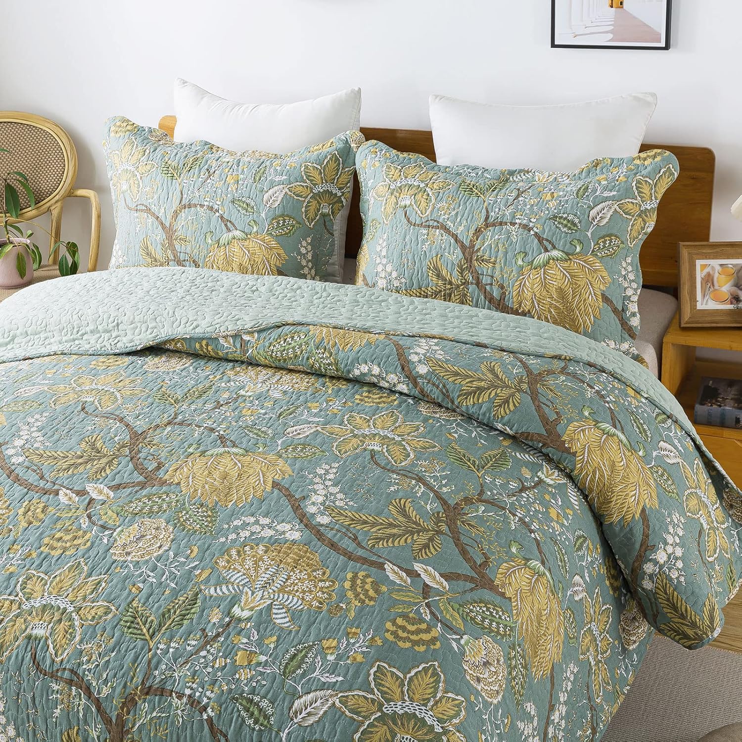 13 reviews for Travan 3-Piece Quilt Set Quilted Bedspread Cotton Coverlet Set Floral Printed Oversized Quilted Bedding Set with Shams for All Season, Green Vine, King Size