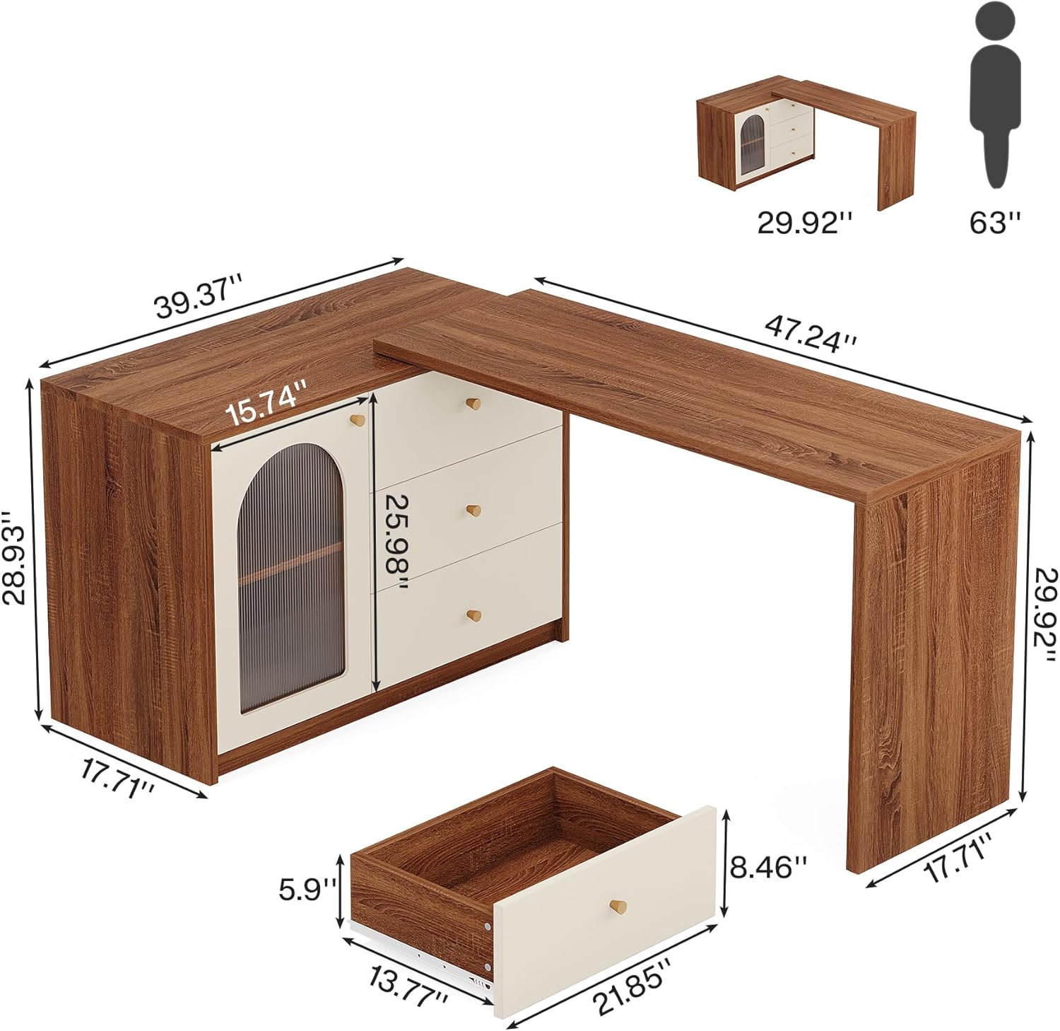 【Reversible L-Shaped Desk】With a flexible and convertible design, this desk can be used as a compact corner desk for small spaces or extended into a straight long desk for larger areas. You can place the drawer cabinet on either the left or right side and adjust the retractable desktop to meet your specific needs. An ideal computer desk for small rooms to create excellent home office space.