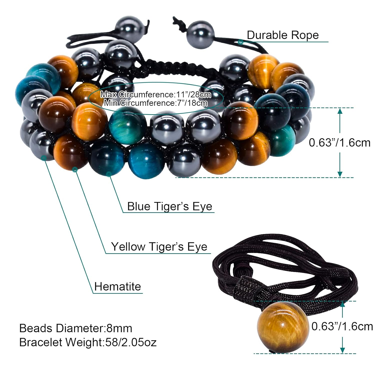 Selected High Quality Material-Each of our tiger eye bracelets is carefully handcrafted by skilled artisans. All beads are made of high quality natural stone with clear and shiny texture.Using a sturdy high-tension nylon rope, three kinds of beads are woven with a stable triangular structure, bringing you more stable and powerful energy. Don’t worry about the elastic breaking.