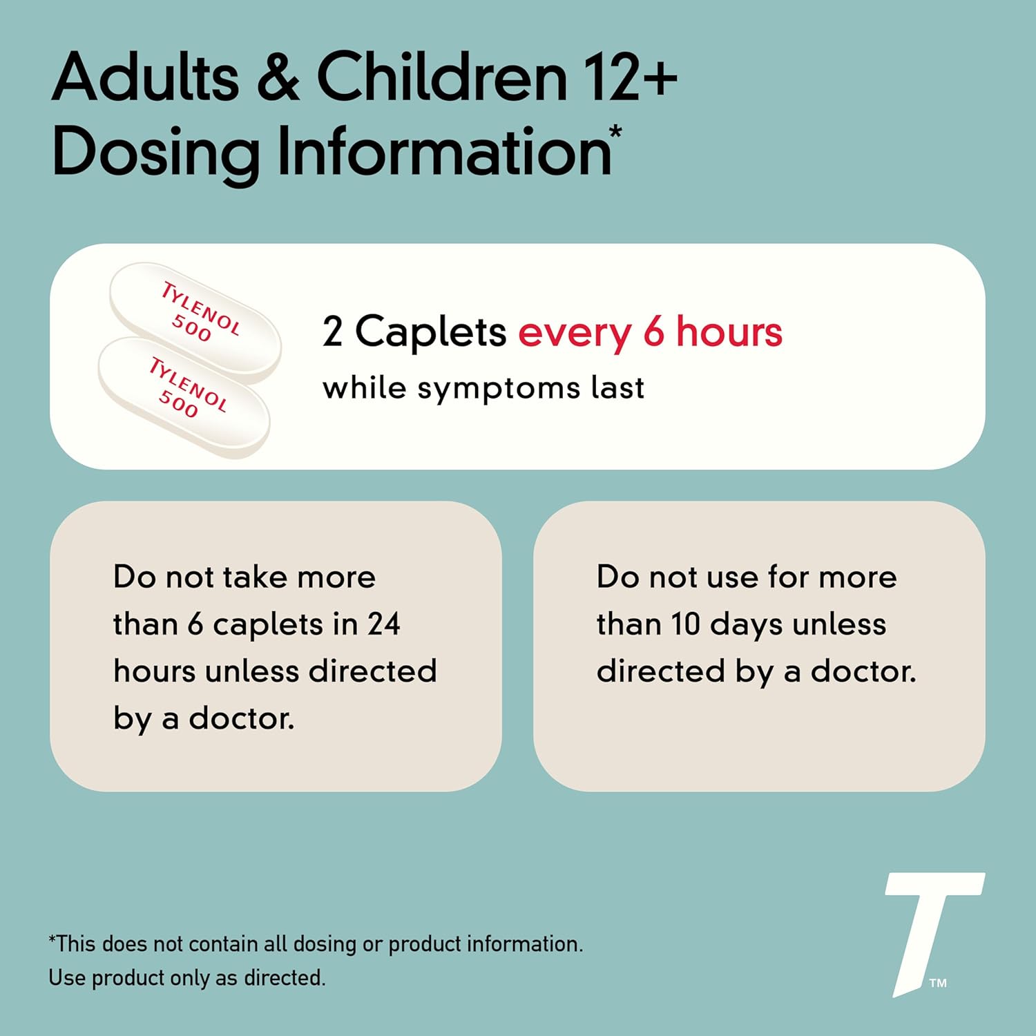 Tylenol Extra Strength pain relief medicine caplets with 500mg of acetaminophen per caplet reduce fever and provide temporary relief of minor aches and pains. From the #1 doctor-recommended brand for pain relief and fever reduction, each caplet contains 500 mg of acetaminophen for effective, extra strength pain relief. Both a fever reducer and pain reliever, Tylenol Extra Strength relieves minor aches and pains due to headache, backache, toothache, minor pain of arthritis, the common cold, and premenstrual and menstrual cramps. When used as directed, these extra strength pain relief pills have an excellent safety profile and can be used by adults and children 12 years and older.