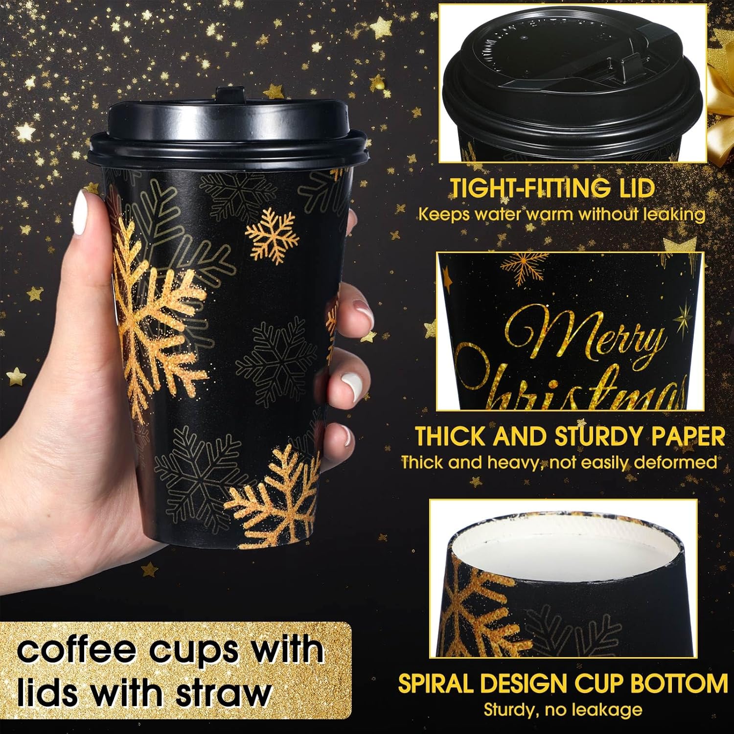 Uiifan 50 Pack 16 oz Christmas Coffee Cups Bulk Black Gold Snowflake Disposable Cups Merry Christmas Paper Cups with Lids Straws Elk Paper Drinking Cups for Kids Christmas Birthday Party Supplies