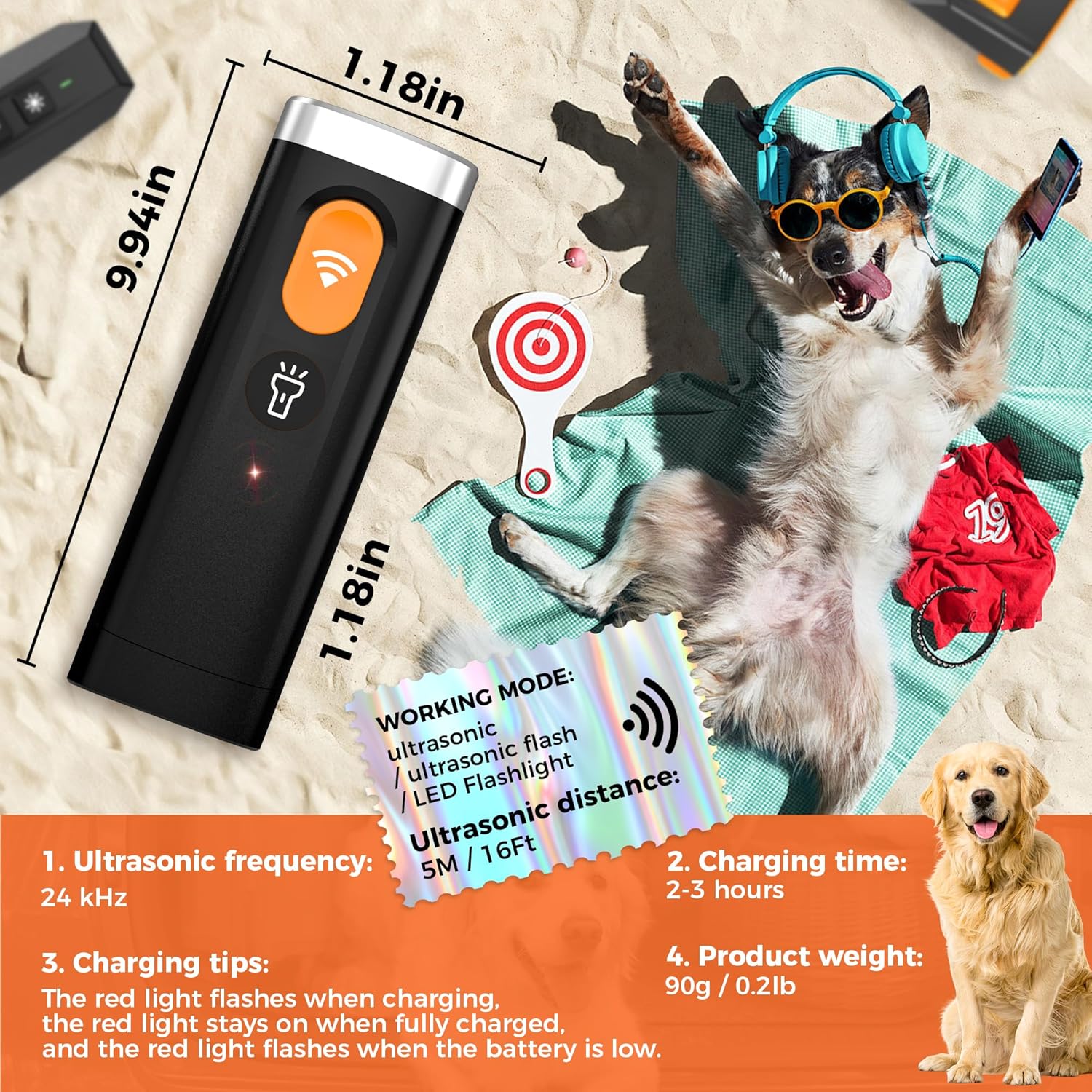 MORE MODES, MORE OPTIONS: This dog barking silencer features multiple modes including ultrasonic strobe, ultrasonic and flashlight, giving you a variety of options to suit your needs. Among them, the ultrasonic strobe mode is particularly prominent, which can enhance the deterrent effect