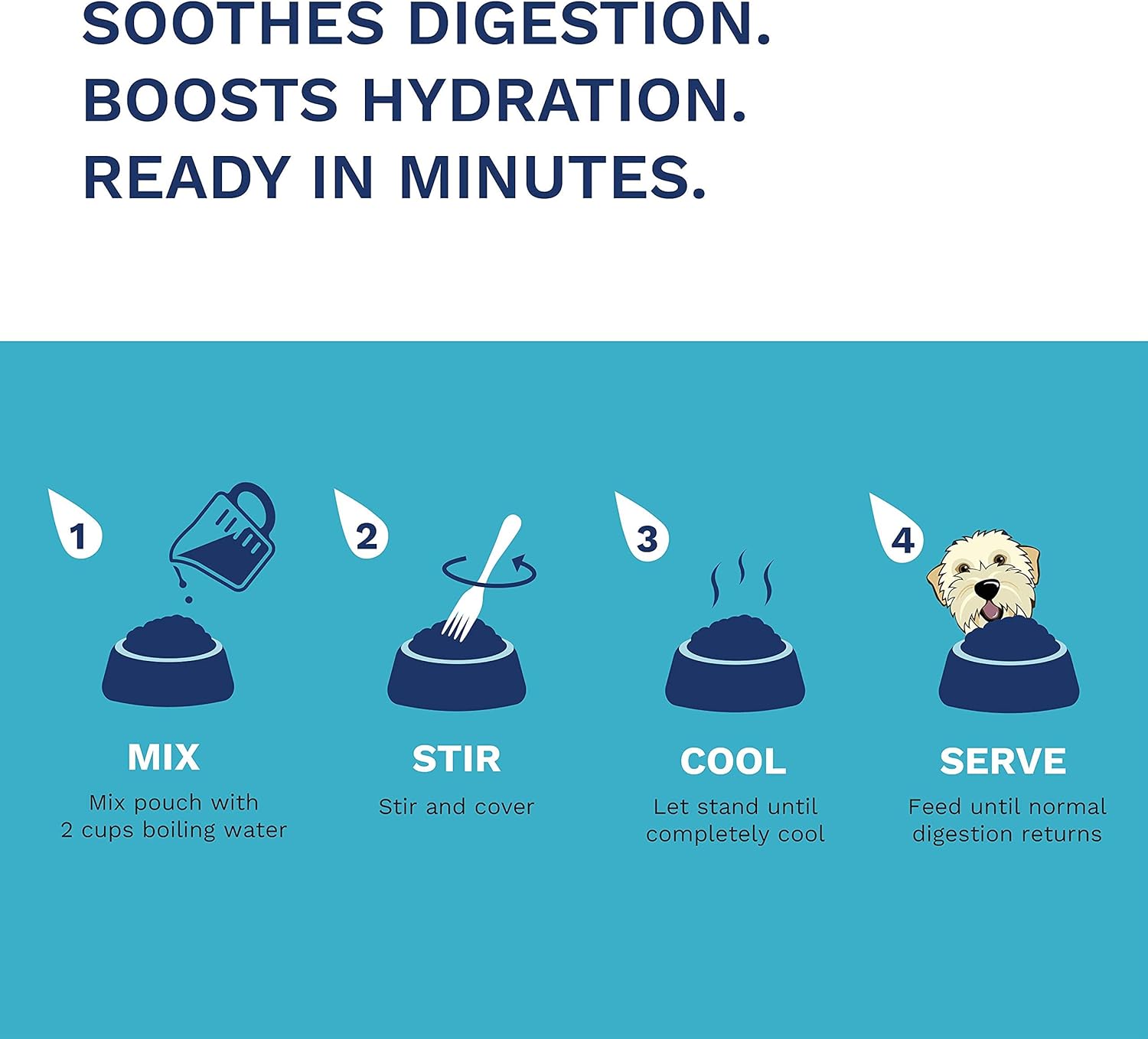 NO MORE COOKING – JUST ADD WATER! When dogs experience digestive upset, including vomiting and diarrhea, vets recommend feeding a “bland diet” to soothe the digestive tract until normal digestion is restored.