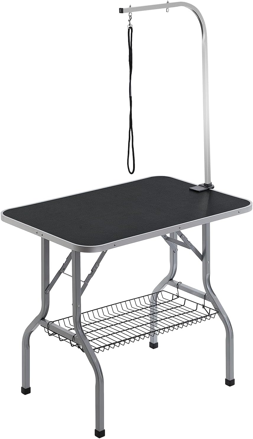 Easy Installation: This pet grooming table is quick and simple to install with just four steps: Step 1 – unfold the grooming table and place it level; Step 2 – clamp the two iron fixtures securely onto the table; Step 3 – attach the H-shaped double arms; Step 4 – finally, install the storage shelf.