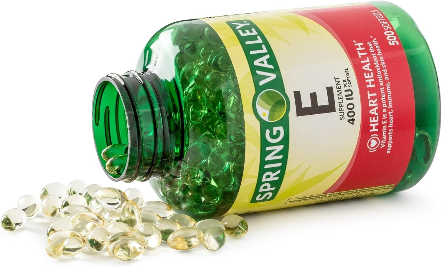 Spring Valley Vitamin E Dietary Supplement, 180 mg, 500 Count Heart health supplement (500) 180mg soft gels No gluten, lactose, added preservatives, added colors, flavors, or salt One soft gel per day 180mg (400 IU) vitamin E per soft gel United States coin image from United Sataes Mint