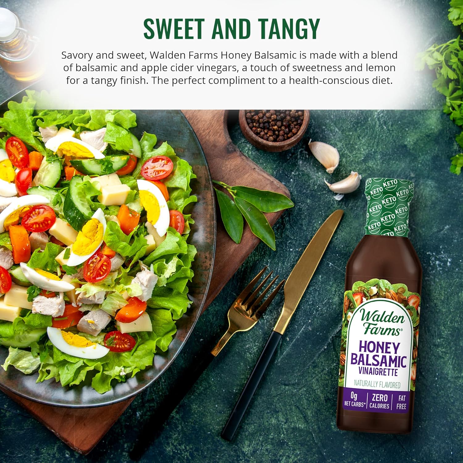 SWEET AND TANGY – Savory and sweet, Walden Farms Honey Balsamic is made with a blend of balsamic and apple cider vinegars, a touch of sweetness and lemon for a tangy finish. The perfect compliment to a health-conscious diet.