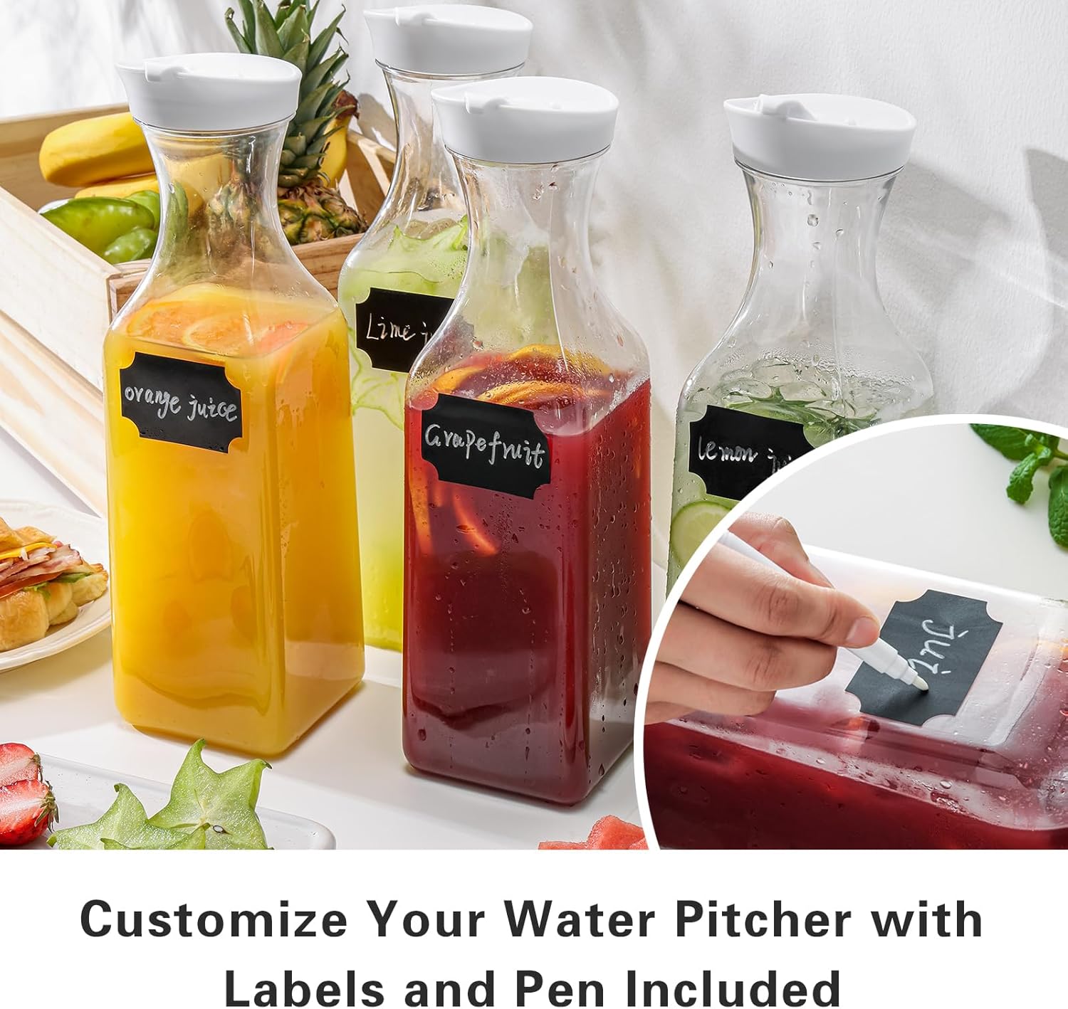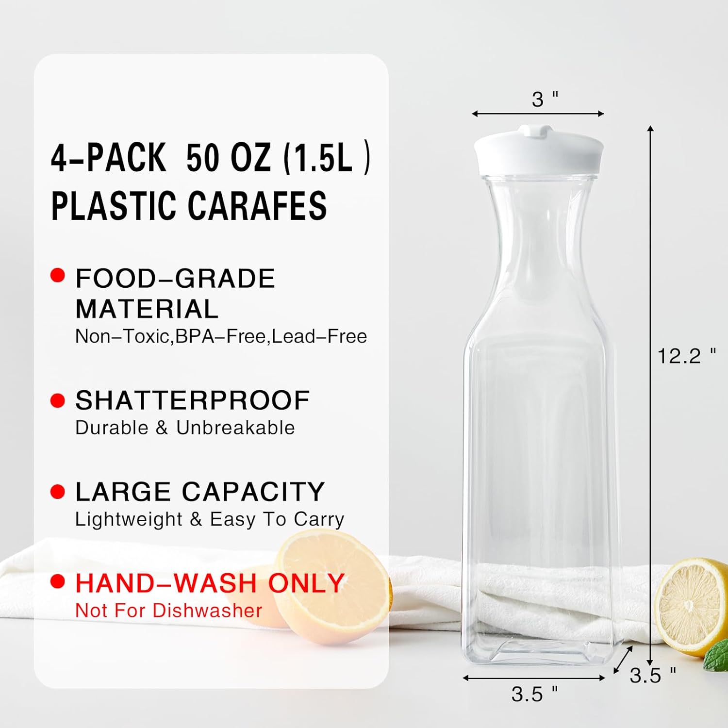 Water Carafe with Lid, 50 Oz Square Plastic Pitcher for Drinks, Milk, Mimosa Bar Supplies, Iced Tea, Juice Containers with Lids for Fridge, BPA-Free, NOT DISHWASHER SAFE, 4 Pack