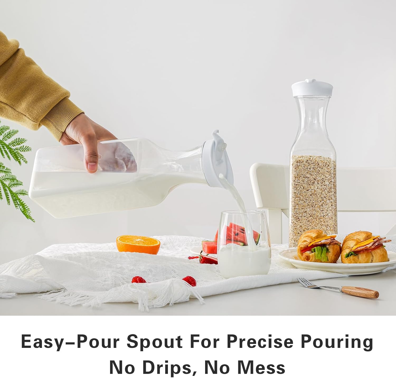I was very excited to get these carafes in and start using them. However, I was disappointed in the quality. The lids don’t stay on very well and they can be prone to leaking. They are also not great for milk or acidic juices as the plastic starts to break down. Very unsafe! I decided to repurpose mine and I use them for my essential oil mixtures for easily filling my diffusers around the house. I still have to be careful that the lids donât spill and they donât leak everywhere, but they do look nice for storing and dispensing these mixtures. I now have to continue my search for better carafes for my milk and juices. I will definitely be going with glass to be safe.