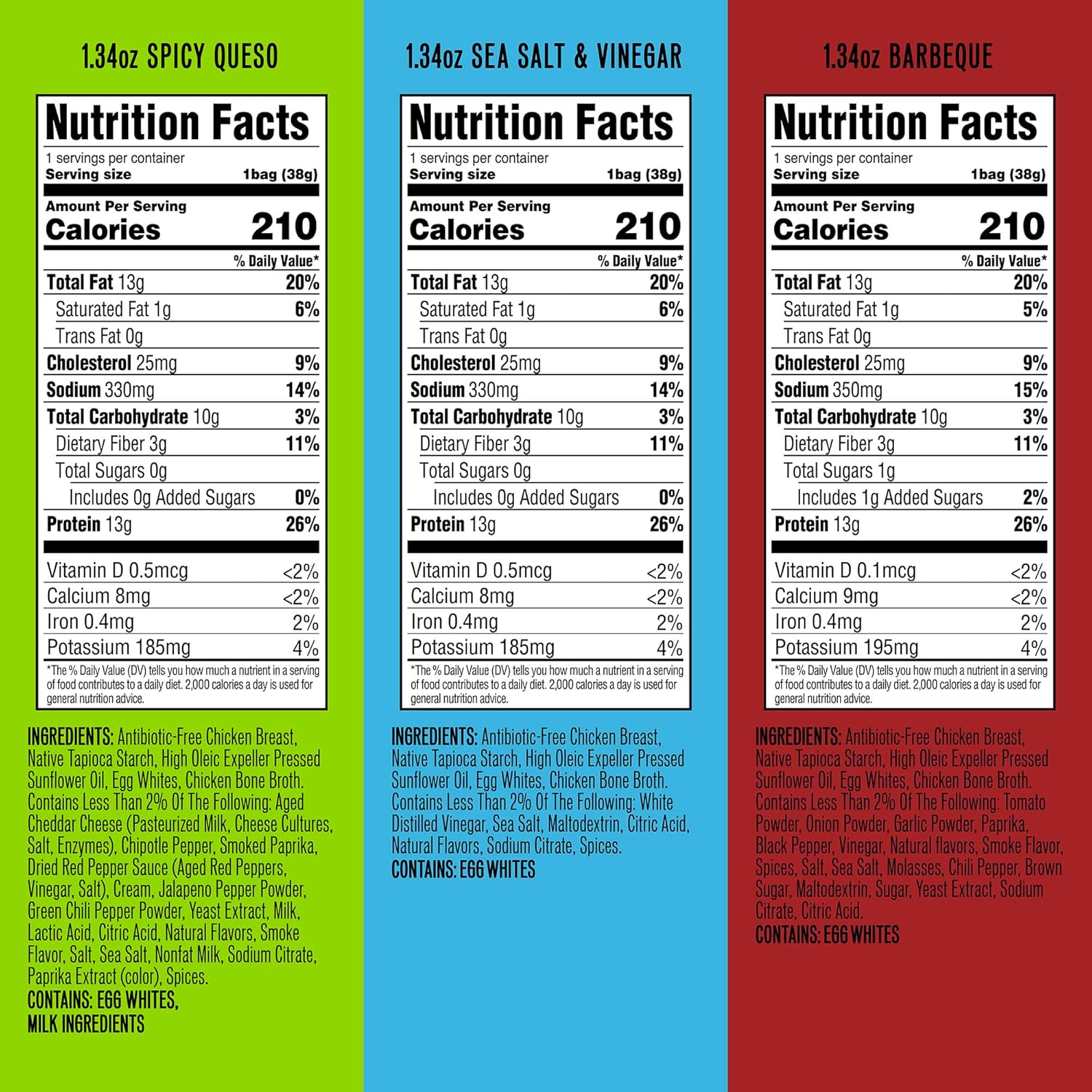 YOUR FAVE FLAVORS, ALL IN ONE SNACK-TASTIC PACK: Contains 2x 1.34oz Chicken & Waffles, 2x 1.34oz Barbeque, 2x 1.34oz Sea Salt & Vinegar and 2x 1.34oz Himalayan Pink Salt, 2x 1.34oz Buffalo, 2x 1.34oz Spicy Queso