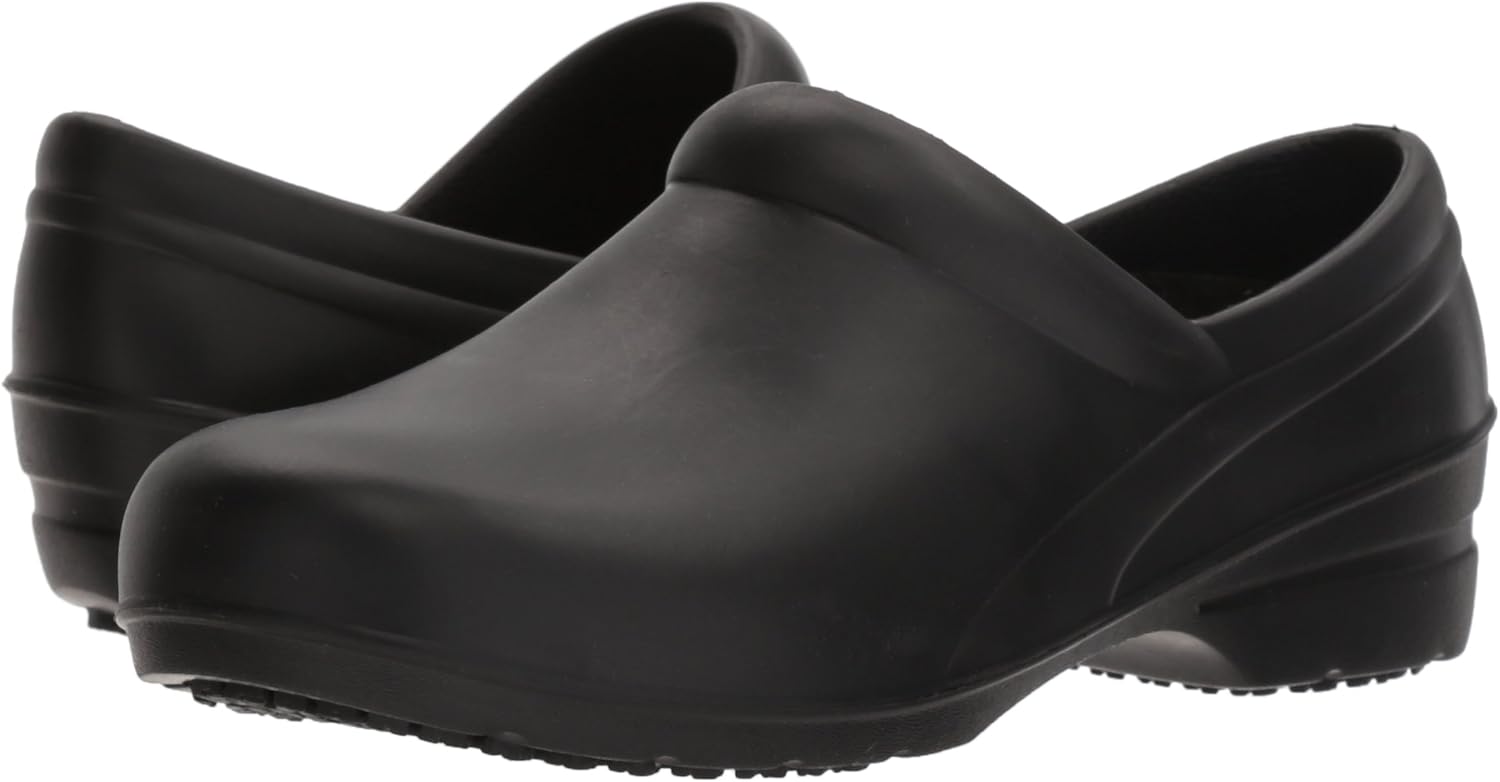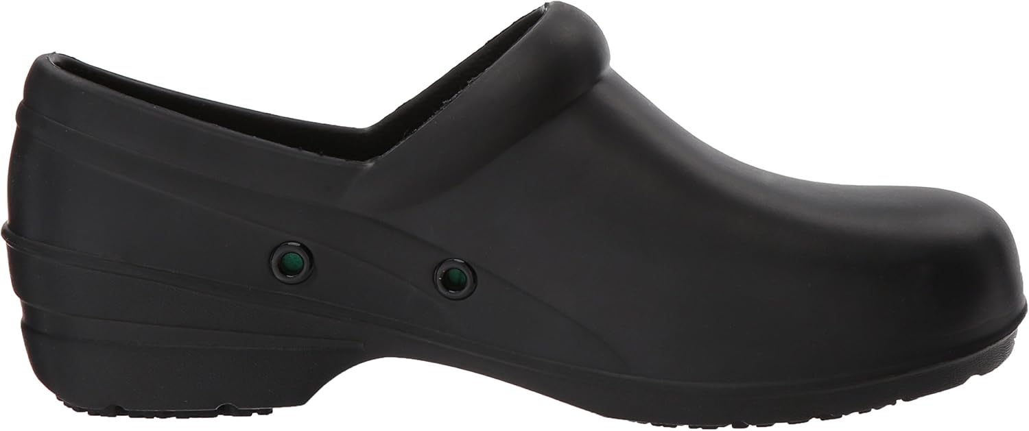 Man made material that is lightweight and very flexible. The insole is made of a high density foam that contours to the foot with arch support and antimicrobial technology. Slip resistant rubber outsole adds to the stability for both oil and water surfaces. Shoe is lightweight making your feet feel fresh all day. Generous toe box leaves the foot feeling fresh all day long.