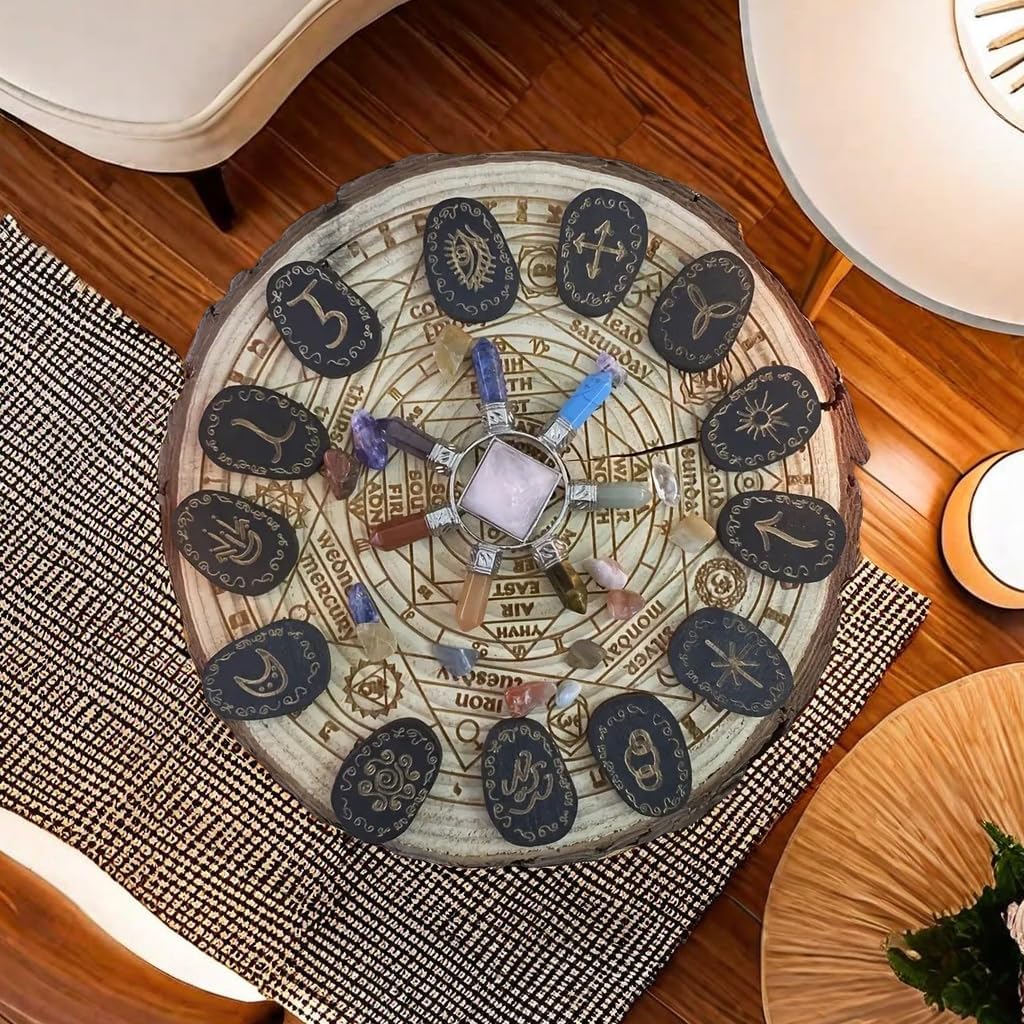 【Enchanting Witchcraft Runes Set】Wooden witch runes set crafted with meticulous detail and featuring 13 enchanted rune stones etched with symbols of the sun, moon, male, female, and more, perfect for your divination and spellcasting rituals.