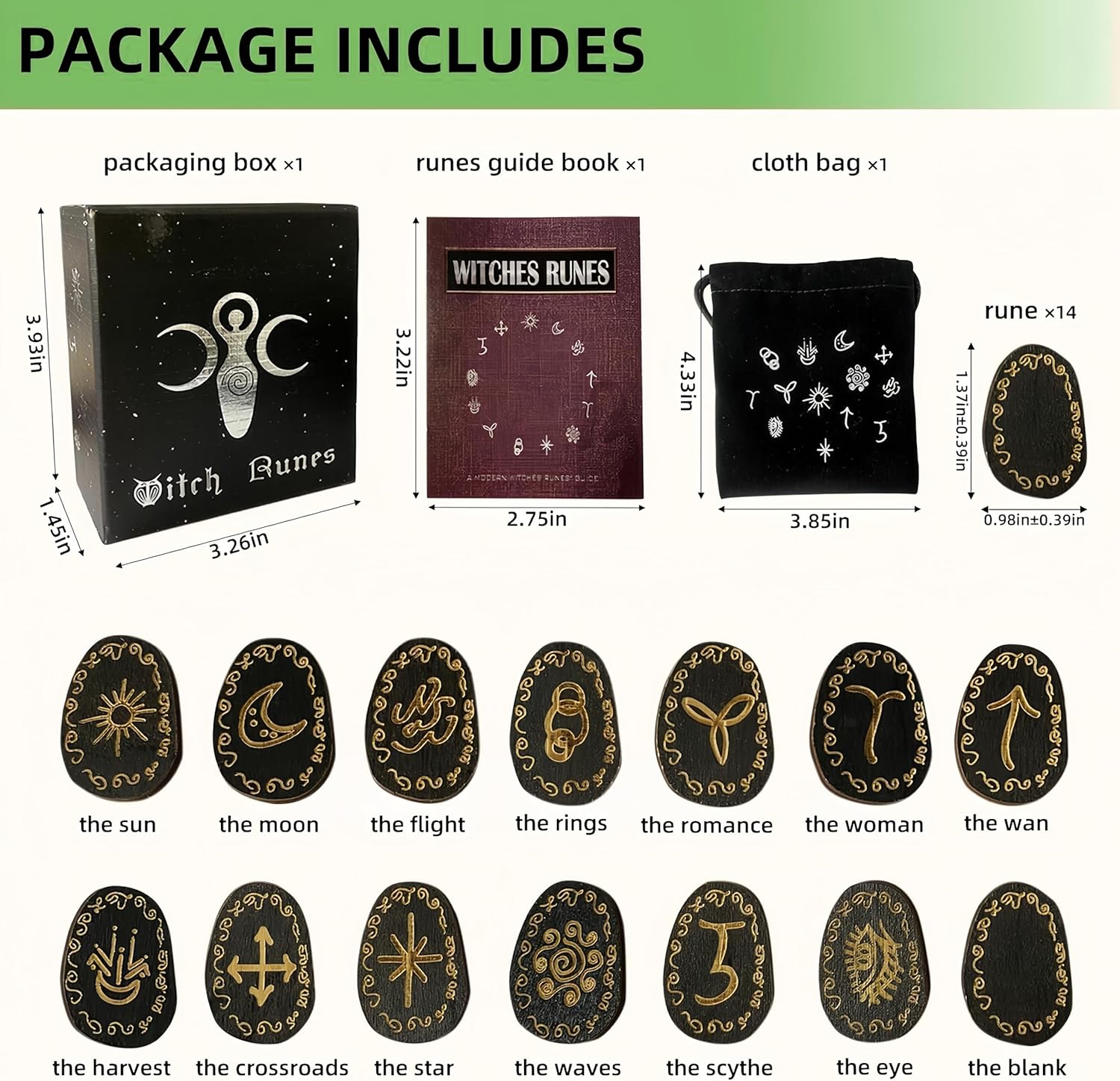 Includes 13 intricately carved runes symbolizing the sun, moon, male, female, and more.Includes 13 intricately carved runes symbolizing the sun, moon, male, female, and more.
