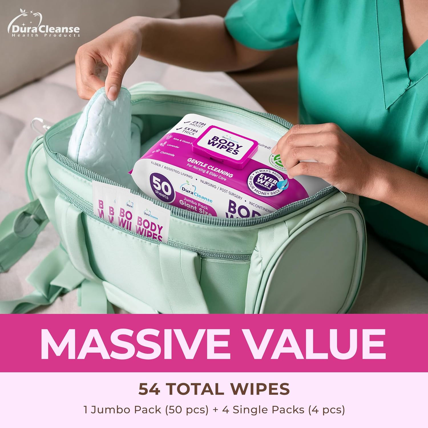 Travel-Friendly Pack: Our soft shell packaging has a tight resealable closure that ensures maximum moisture retention. Its simple peel-off cover allows quick and easy access to the wipes while on the go. You get 50 large wet wipes with free 4 individually packed travel-size bath wipes. Perfect as elderly care must haves, incontinence wipes, bedridden patient products, post op shoulder, breast or ankle surgery recovery supplies, and shower alternative adult cleaning wipes.
