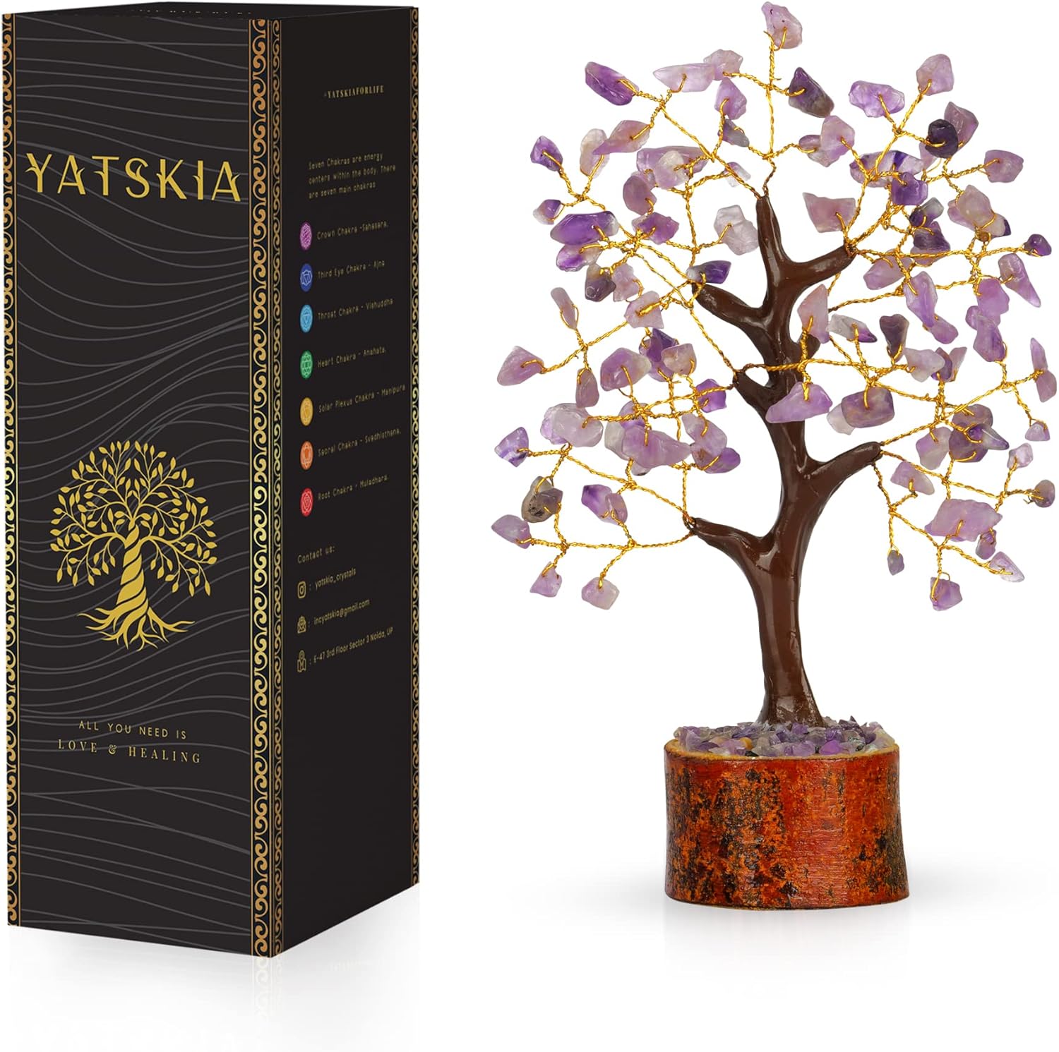 Crystal Tree For Positive Energy – Back in positivity with our chakra tree of life, crafted from natural amethyst crystals, this feng shui luck figurine comes with an natural wooden wooden base and golden wires. Perfect for chakra healing, home decor & gifting purposes.