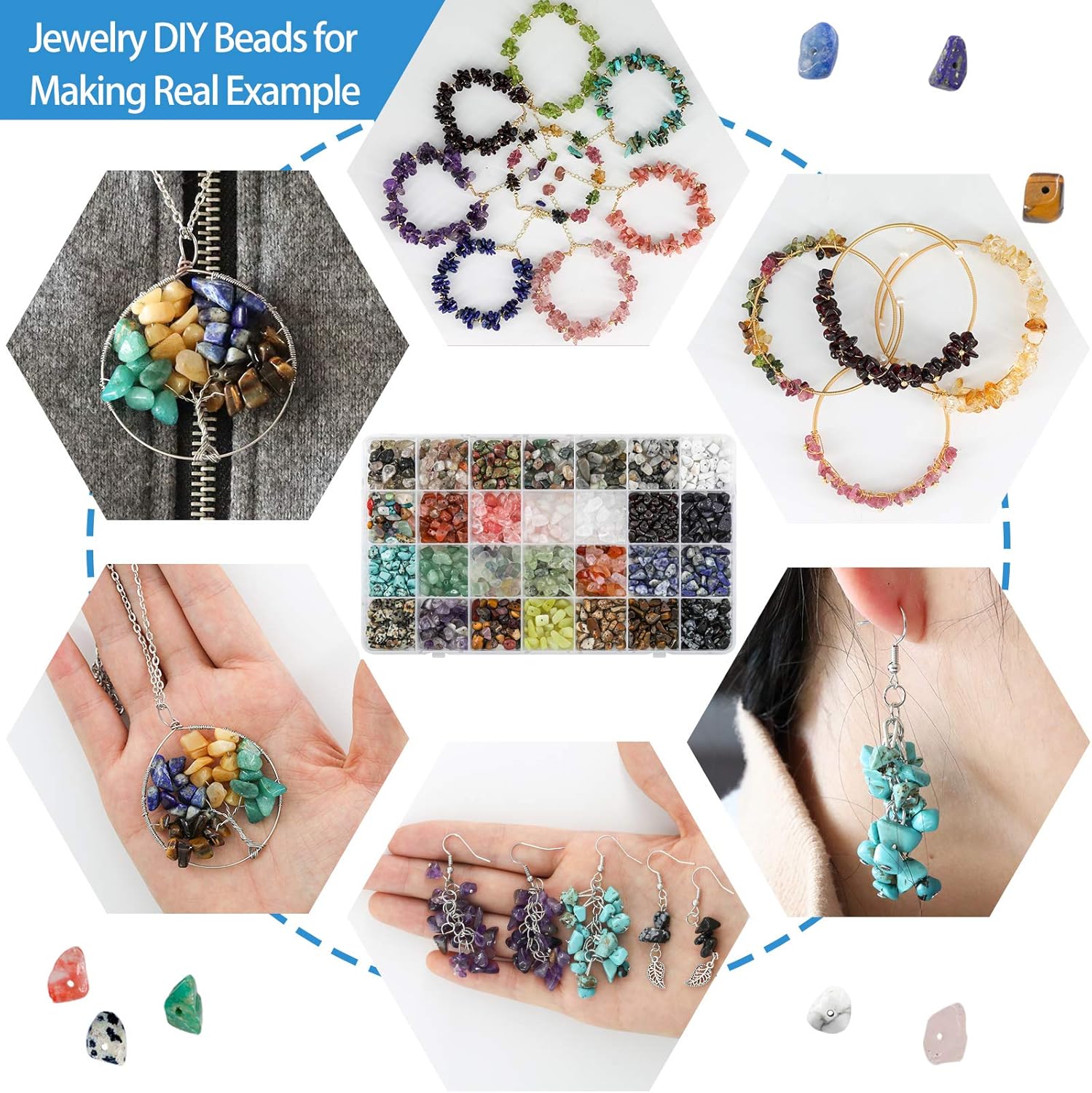 Packaging Includes:totally 1330pcs natural chip stone beads great value starter kit, approximately 1120pcs natural chip stone beads in 28colors,with 50pcs 5mm jump rings,50pcs 2.2cm head pins,50pcs 2.2cm eye pins,30pcs earring hooks,2pcs 3.3feet jewelry chain,10pcs pinch clasp bails,5pcs lobster clasp,6pcs pendants charms,1pcs steel wire,1pcs pliers,1pcs copper beading wire,2pcs 0.5mm crystal elastic string, great for beginners to make chip beads earring,bracelets and tree of life pendants.