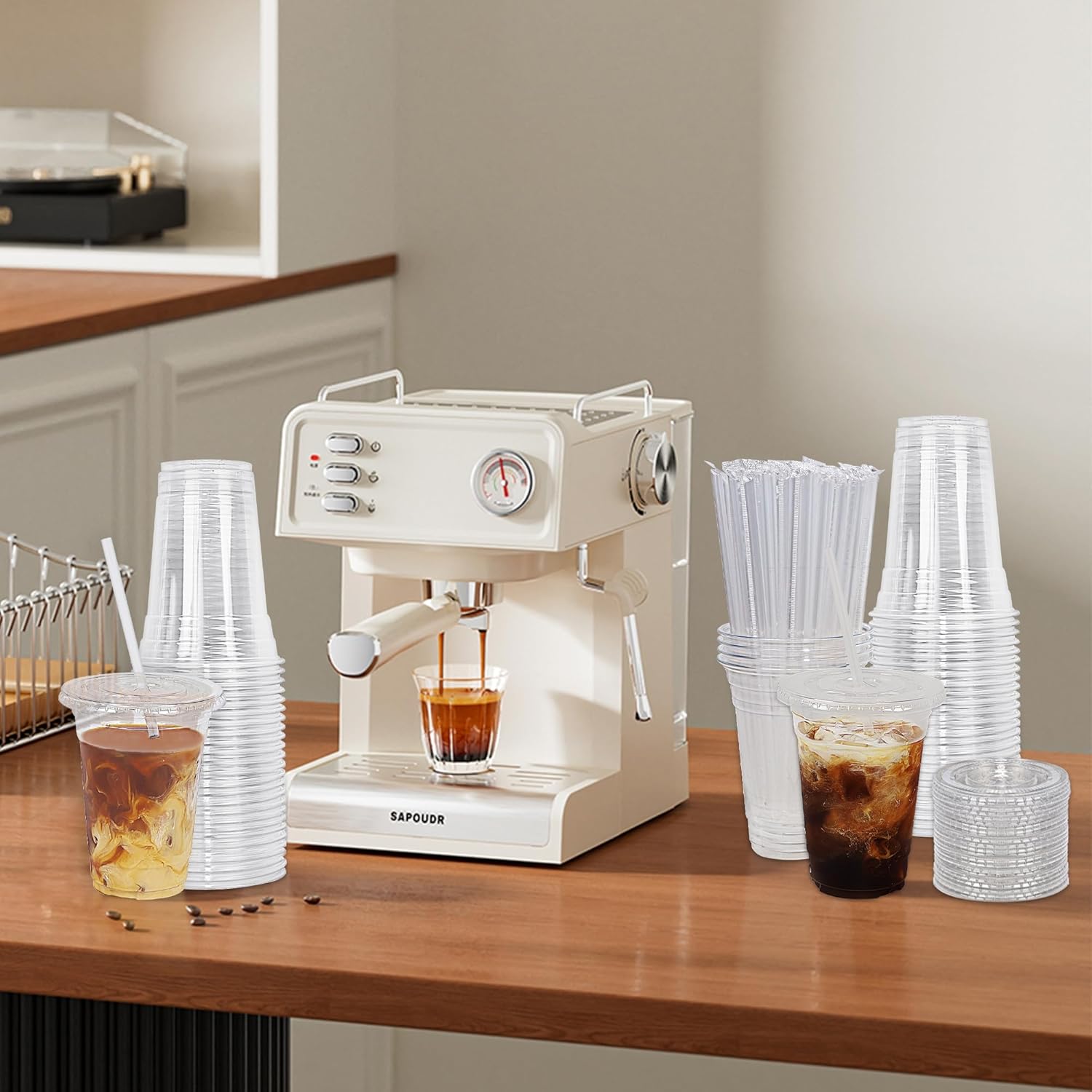 Coming with 100 cups, 100 lids and 100 straws, the PET cup set owns glass-like clear look, which is thick, food-grade and sturdy. It withstands temperatures ranging -40℉~158℉(-40℃~70℃).