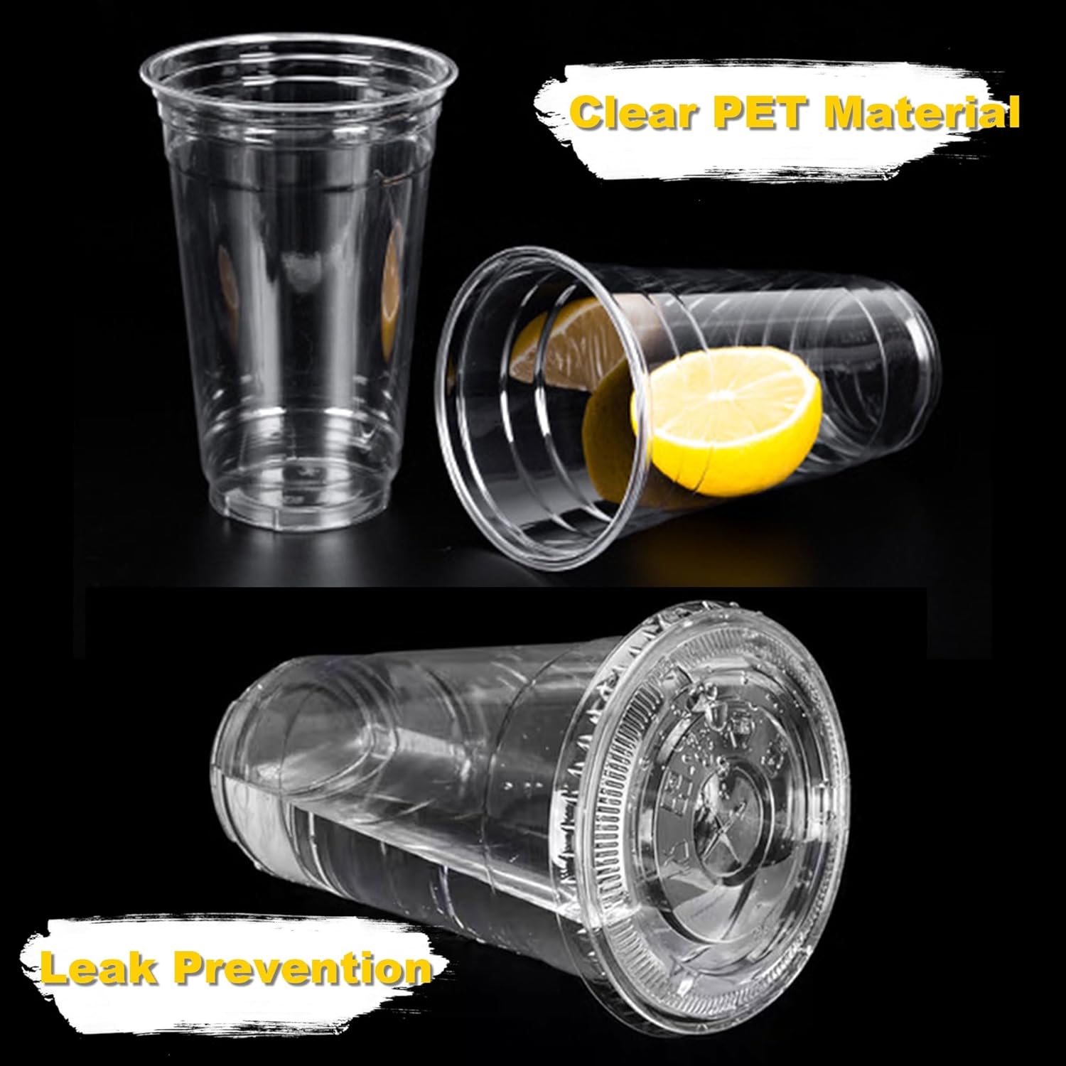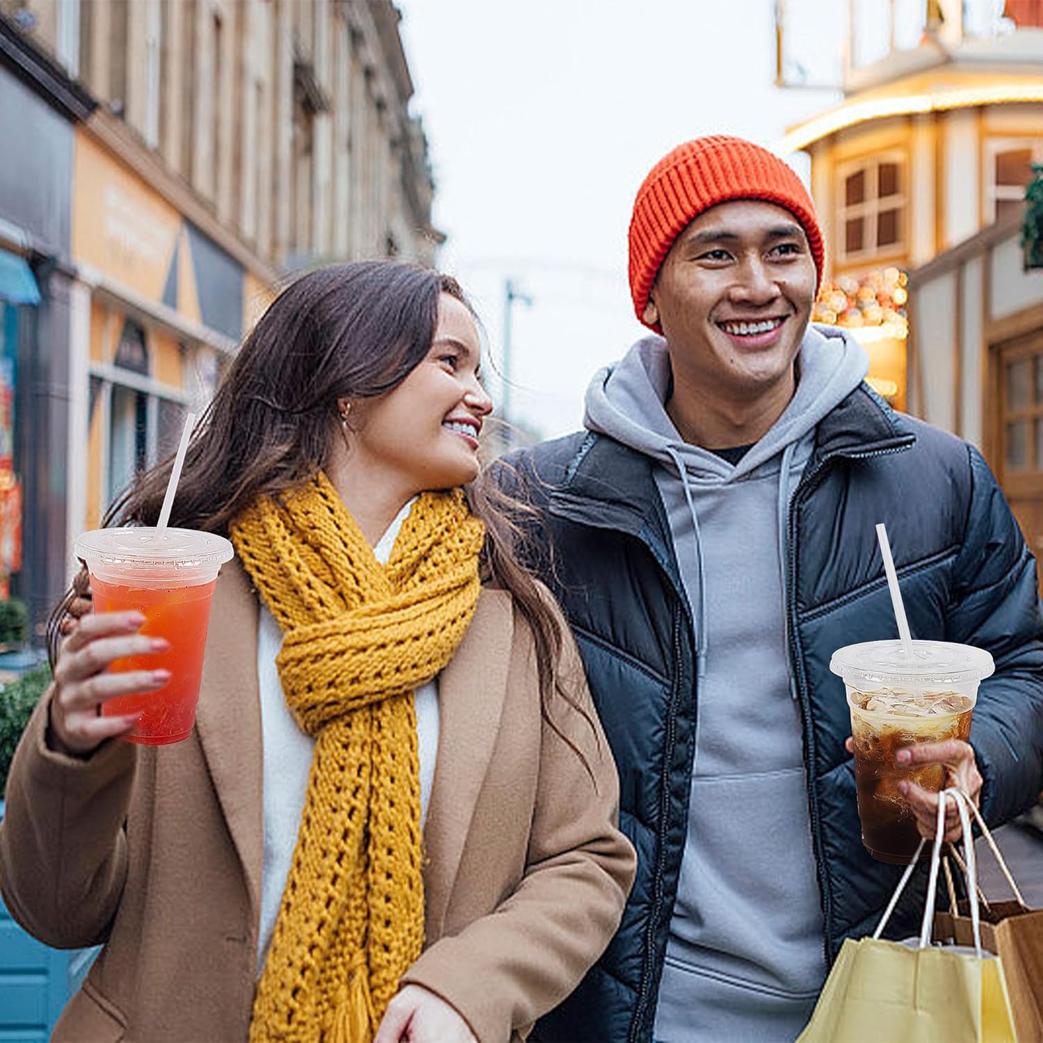 Zcaukya 100 Sets 16oz Clear Plastic Cups with Flat Lids & Straws, Disposable To-Go Cups for Iced Coffee, Soda, Smoothies, Fruit Juices, Iced Tea and Other Cold Soft Drinks