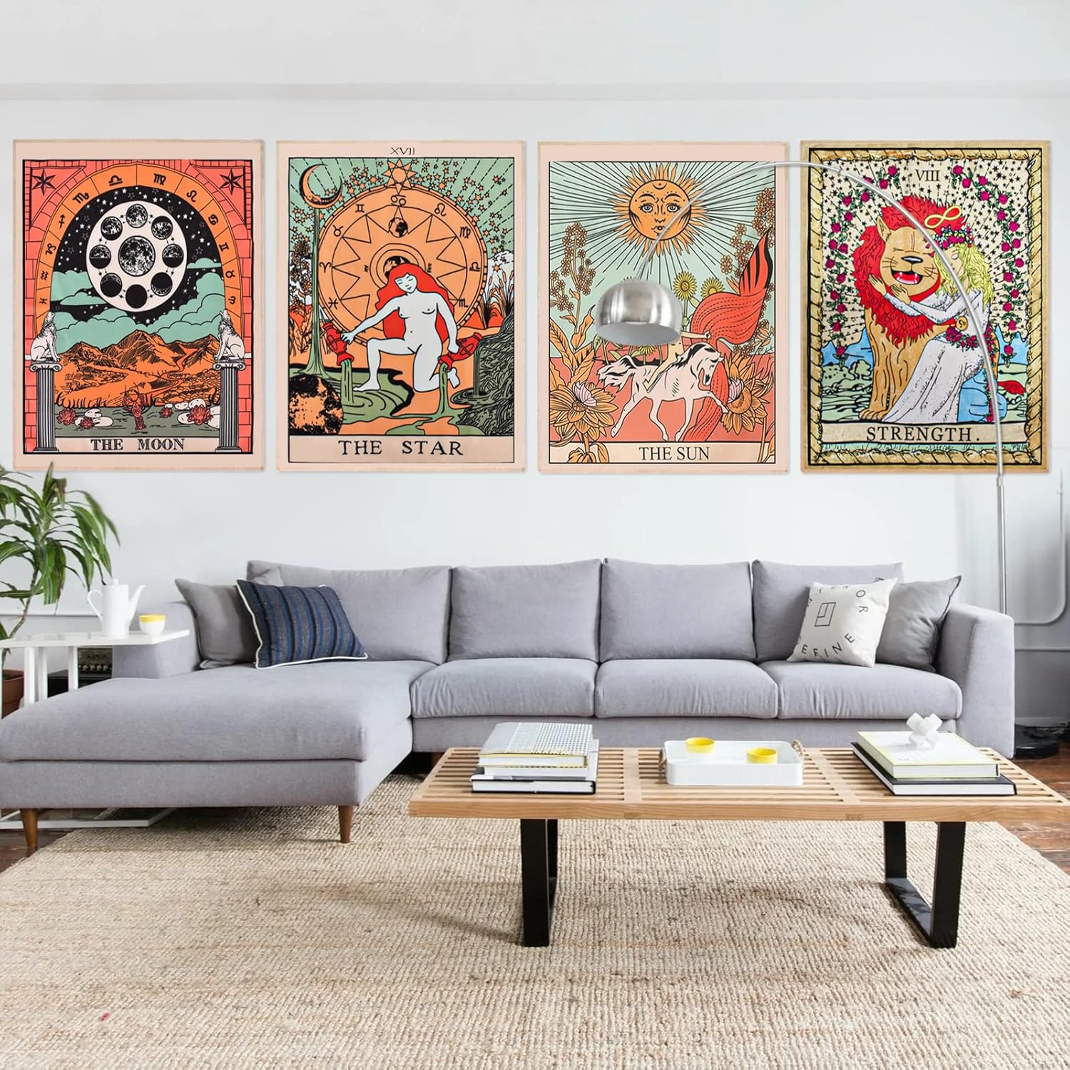 🌷【4 Pcs Orange Tarot Tapestry】-Four different ancient patterns tarot card tapestry, including the sun, the moon, the star and strength. This mysterious tarot tapestry is made of microfiber peaches with neat edges and hand-stitched, with an elegant appearance and silky soft feel. Durable, wrinkle-free, non-sticky, skin-friendly and lightweight. Hang them in the room to add mystery to your room