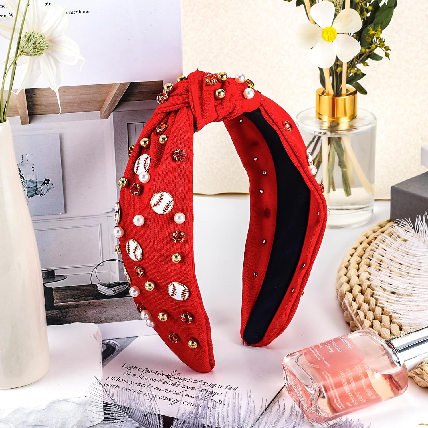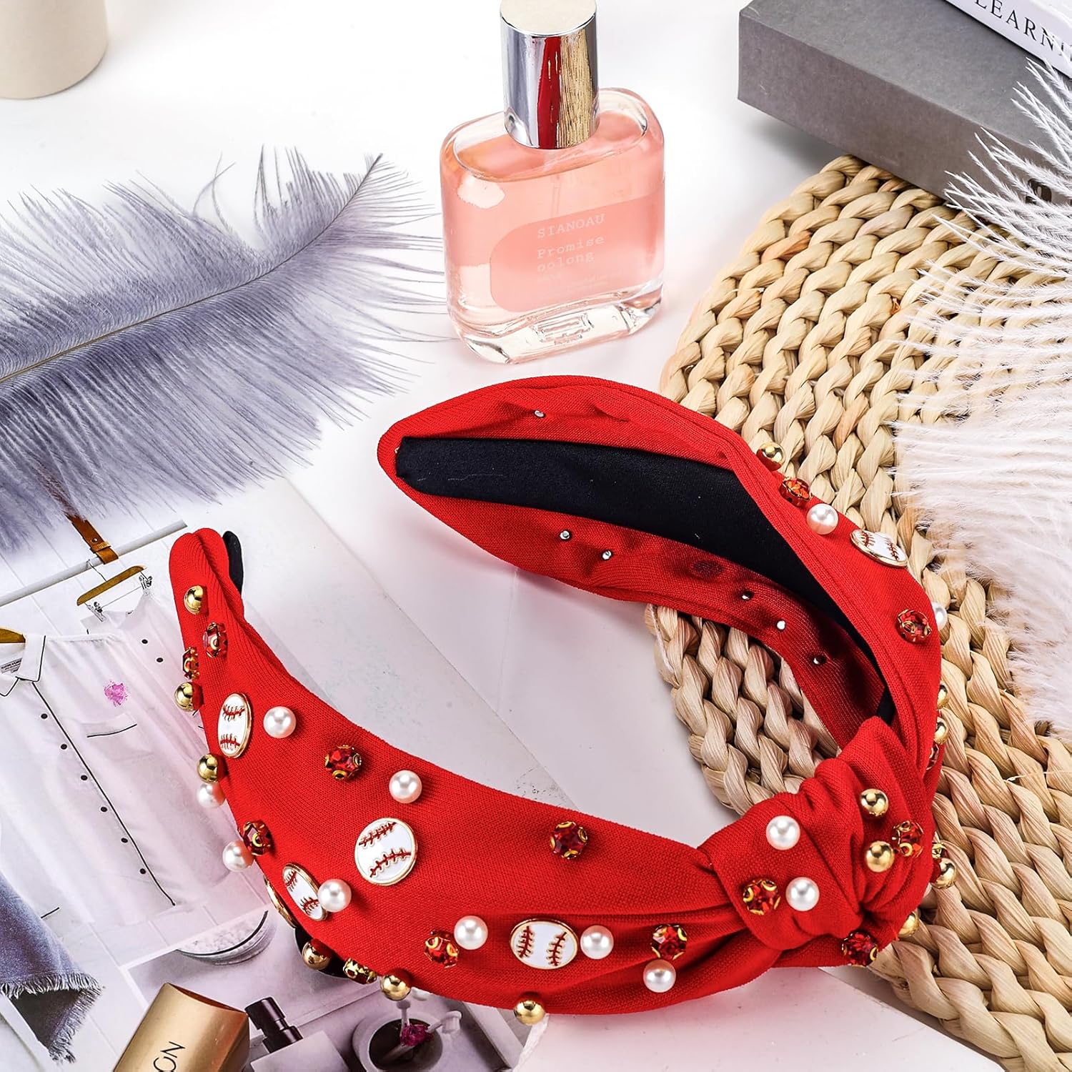 Zkptops Baseball Knotted Headband for Women Fun Sports Team Game Day Twisted Top Knot Headbands Crystal Pearl Jeweled Head Band Fashion Sparkly Hairband Accessories Gifts for Sports Fans(Red)