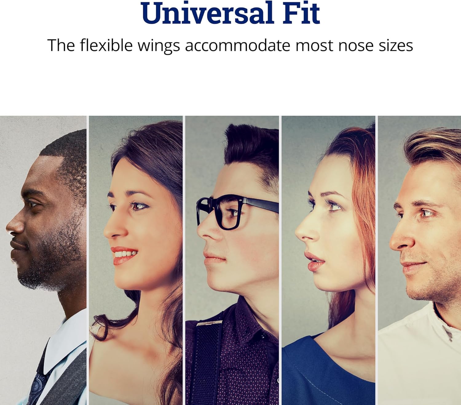 Comfortable Fit: Conforms to the natural shape of your nose for the best fit and seal; The flexible wings fit all sizes; This adhesive-free breathing aid causes no skin irritation or blemishes even with prolonged use